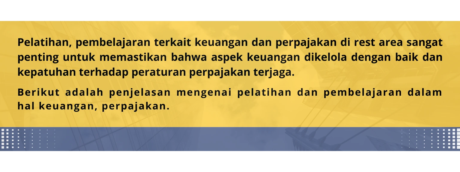 Pelatihan, pembelajaran dalam keuangan dan perpajakan bertujuan untuk memastikan bahwa staf di rest area dapat mengelola aspek keuangan dengan efisien, mematuhi peraturan perpajakan, dan mengoptimalkan strategi perpajakan.