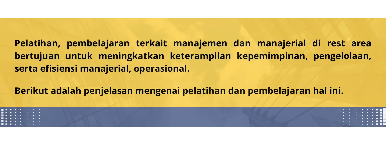 Pelatihan dan learning ini bertujuan untuk memastikan bahwa manajer di rest area memiliki keterampilan yang diperlukan untuk memimpin dengan efektif, mengelola operasi dengan efisien, dan mencapai tujuan bisnis.