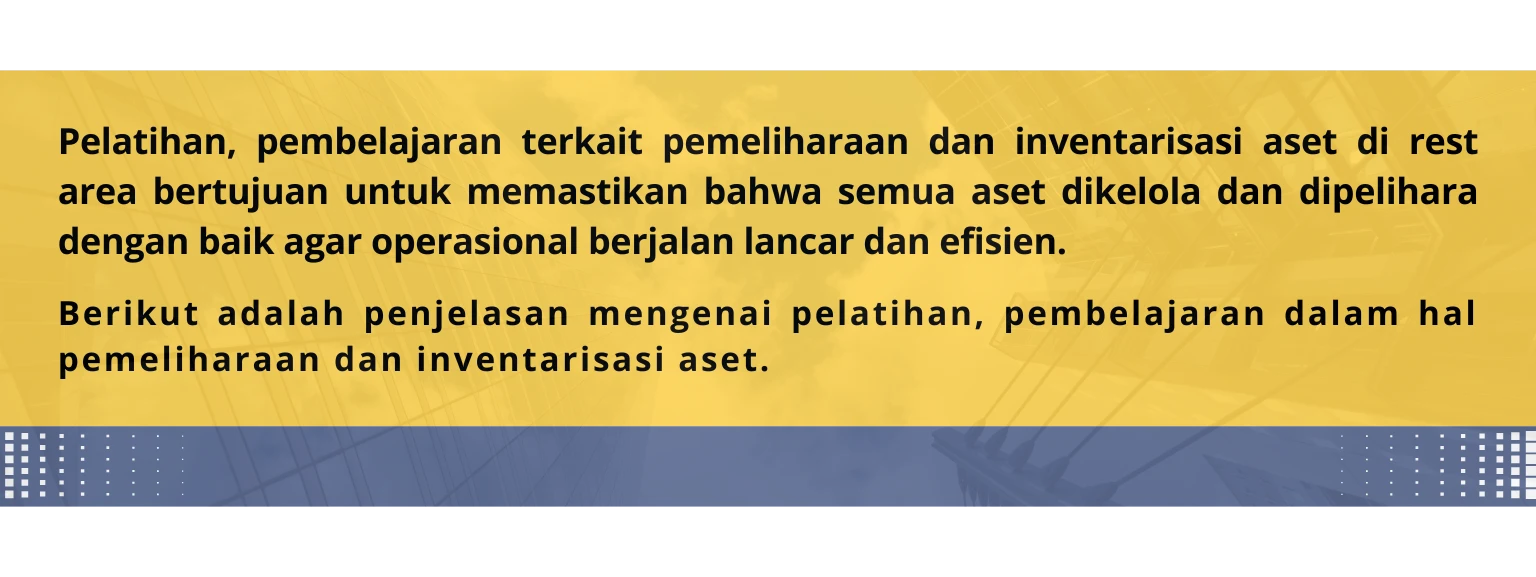 Pelatihan, pembelajaran dalam pemeliharaan dan inventarisasi aset bertujuan untuk memastikan bahwa aset di rest area dikelola secara efisien, dipelihara dengan baik, dan dilacak dengan akurat.